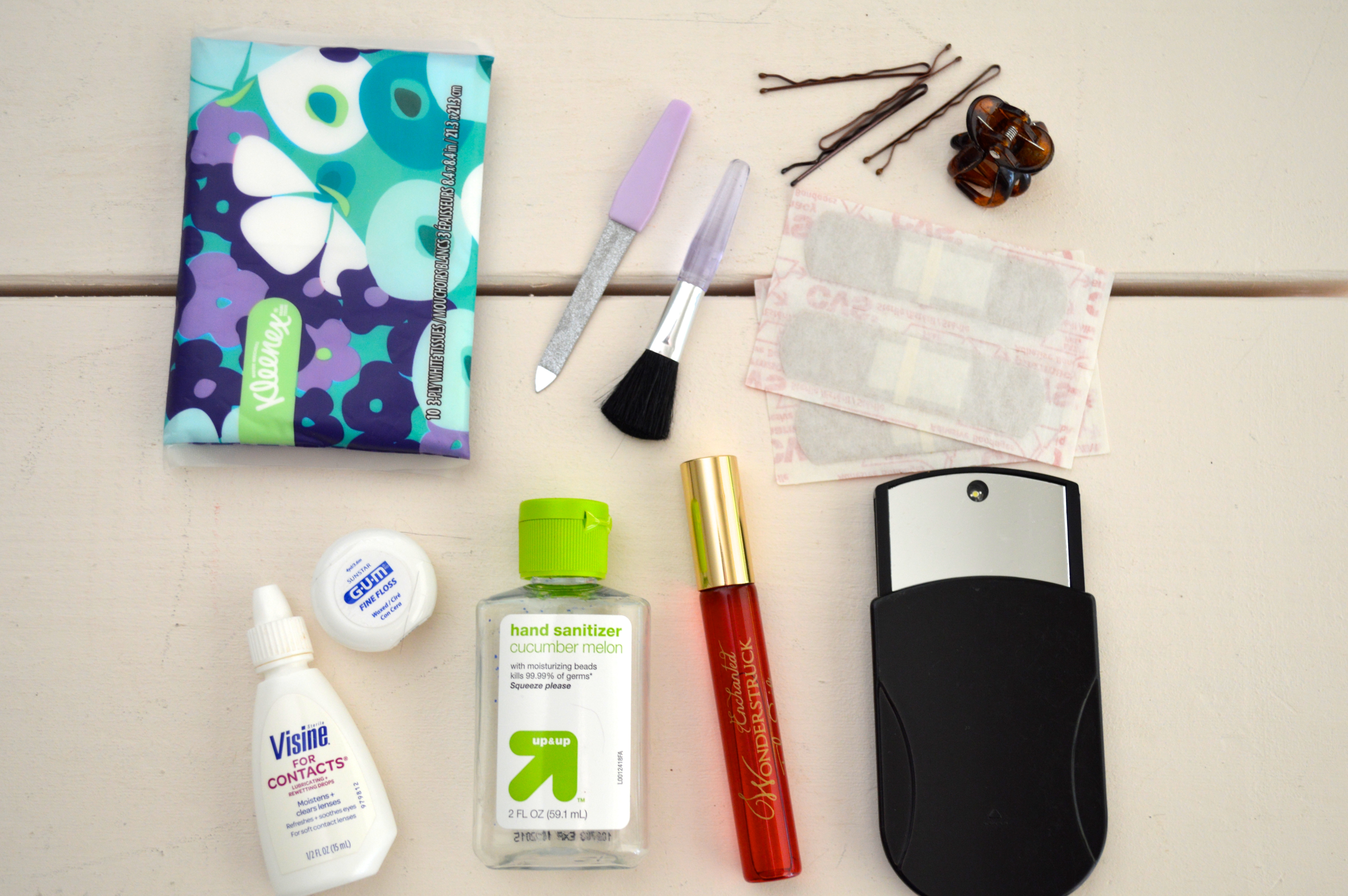 Tissues– if you’re sick… or sweaty or just need a tissue Bobby pins– when do you not need a bobby pin? Floss– I use the floss in my purse way more than I ever thought I’d ever use the floss in my purse Perfume stick– if you need to feel a little refreshed during a long day Hand sanitizer– because I’m a germaphobe Band aids– for when your feet are bleeding and you have no backup shoes Nail file– always comes in handy Makeup brush– actually I don’t think I’ve ever used this… Mirror– if you ever need a mirror in the dark, this one has a light Visine for contacts– after staring at a computer for 8 hours sometimes my eyes need a little refresh.