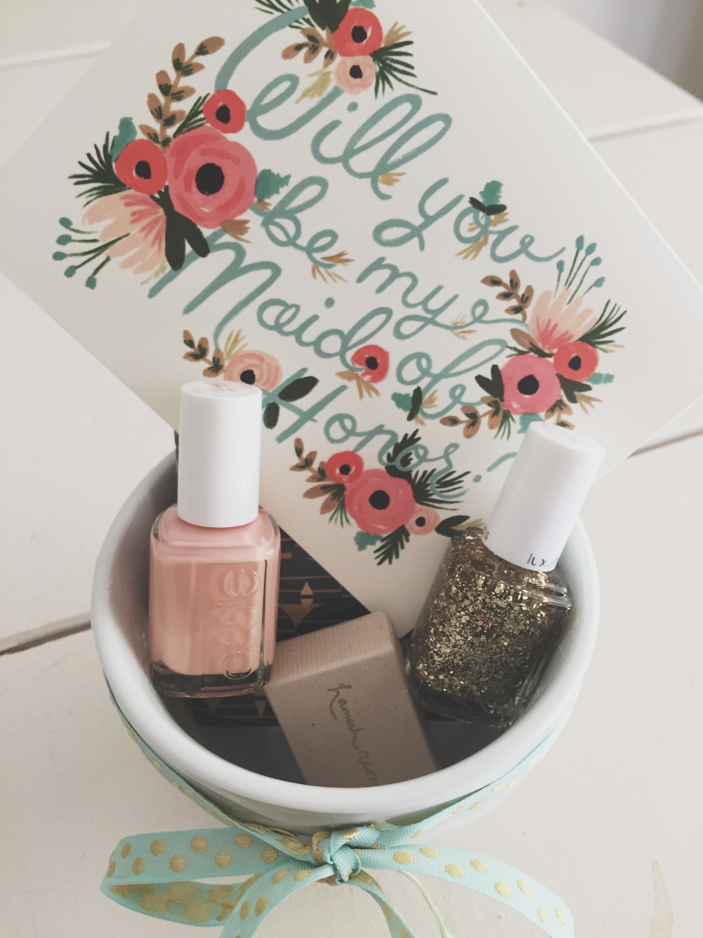 I wanted to do something special to ask my sister to be my maid of honor, so I put together a little bowl of presents for her. I loved how it turned out and she loved it too!